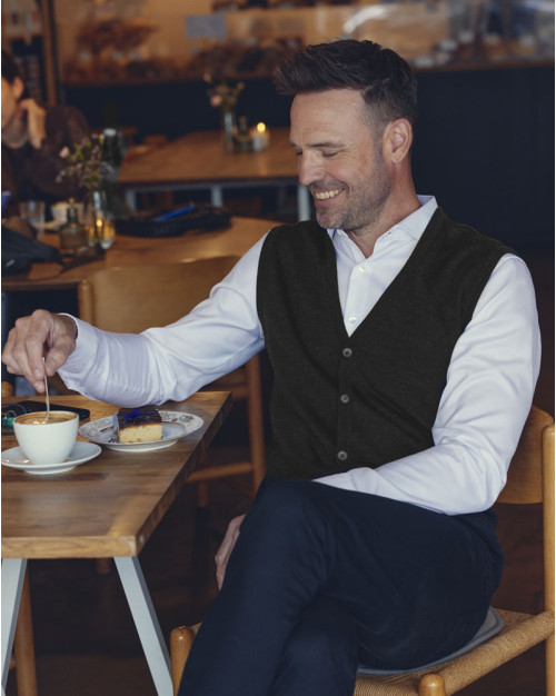 Clipper strik vest til mænd, lavet af merceriseret merinould for overlegen kvalitet og finish. Merceriseret for glattere og stærkere fibre. Fremstillet med et italiensk garn, der er specielt udviklet til CLIPPER. Ekstra snoet garn for holdbarhed og høj formbevarelse. Denne herre strikvest tilbyder uldens naturlige fordele, herunder fugttransport, temperaturregulering og lugtresistens. Blød og luksuriøs fornemmelse for ultimativ komfort. Anti-rynkeegenskaber for at opretholde et præsentabelt udseende hele dagen. 1x1 ribkant med elastisk kant for en sikker og fleksibel pasform. Knapper ved stolpelukning og to forlommer med rørformet finish.Se andre alternativer