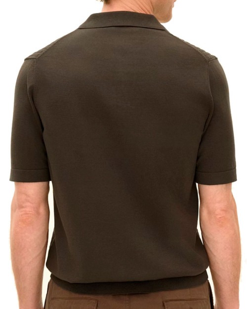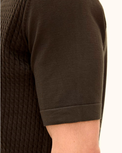 Kortærmet strikket sweater med krave i garment-dyed bomuld. Strikket i 12 gauge(maskefinhed) med en flot kabelstruktur foran. Uden knapper foran, hvilket giver et mere afslappet look. Fint stykke tøj at bruge med afslappede bukser, men kan lige så godt bruges under et afslappet jakkesæt eller en jakke.