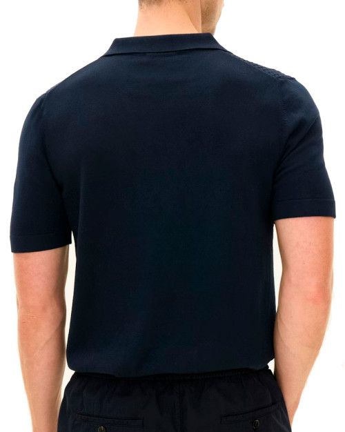 Kortærmet strikket sweater med krave i garment-dyed bomuld. Strikket i 12 gauge(maskefinhed) med en flot kabelstruktur foran. Uden knapper foran, hvilket giver et mere afslappet look. Fint stykke tøj at bruge med afslappede bukser, men kan lige så godt bruges under et afslappet jakkesæt eller en jakke.