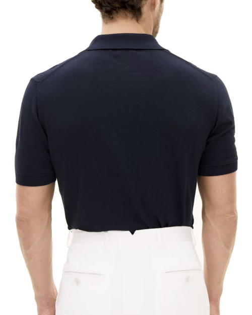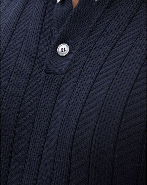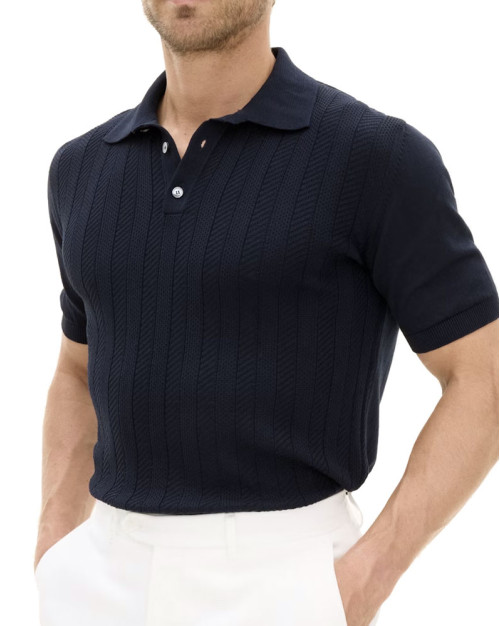 Kortærmet striktrøje/poloshirt til mænd med krave, i bomuld med en elegant struktur foran, strikket i 12gg. Trøjen har en formstrikket krave og er dekoreret med tre perlemorsknapper foran. Den er stilfuld og fungerer lige så godt alene som under en jakke.