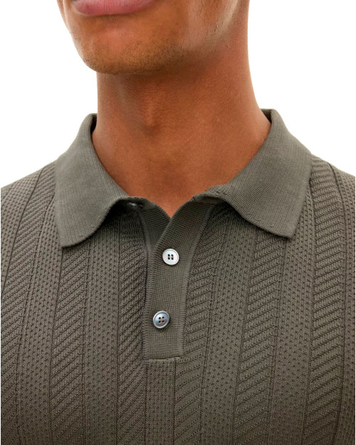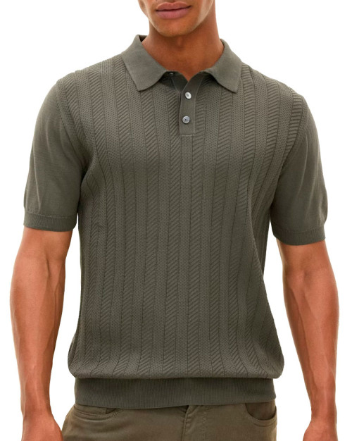 Kortærmet striktrøje/poloshirt til mænd med krave, i bomuld med en elegant struktur foran, strikket i 12gg. Trøjen har en formstrikket krave og er dekoreret med tre perlemorsknapper foran. Den er stilfuld og fungerer lige så godt alene som under en jakke.