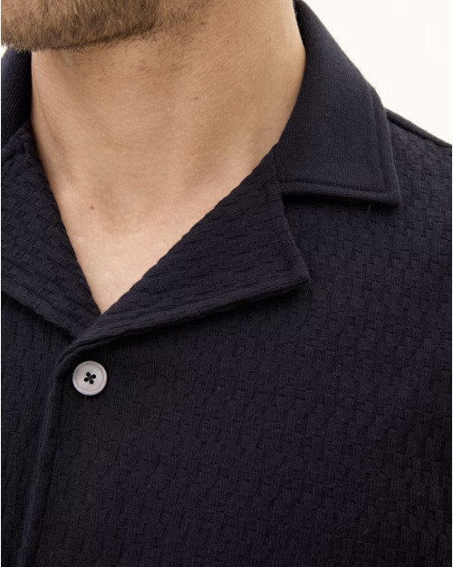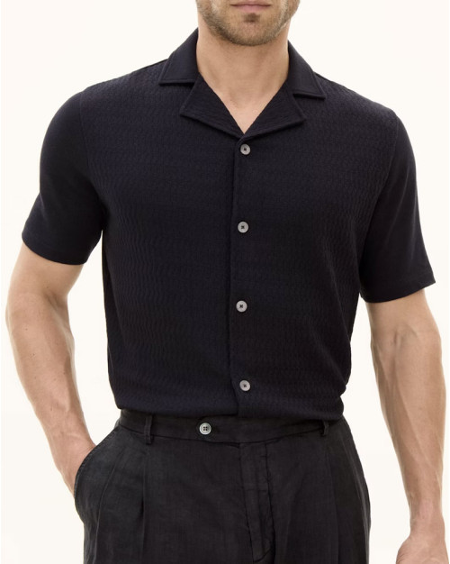 Oscar Jacobson kortærmede strik skjorte i bomuldsstrik, lavet af bomuldsjersey med en fin struktureret front, har perlemorsknapper, der giver et sofistikeret præg. Skjorten er både komfortabel og luftig – ideel til varme sommerdage.